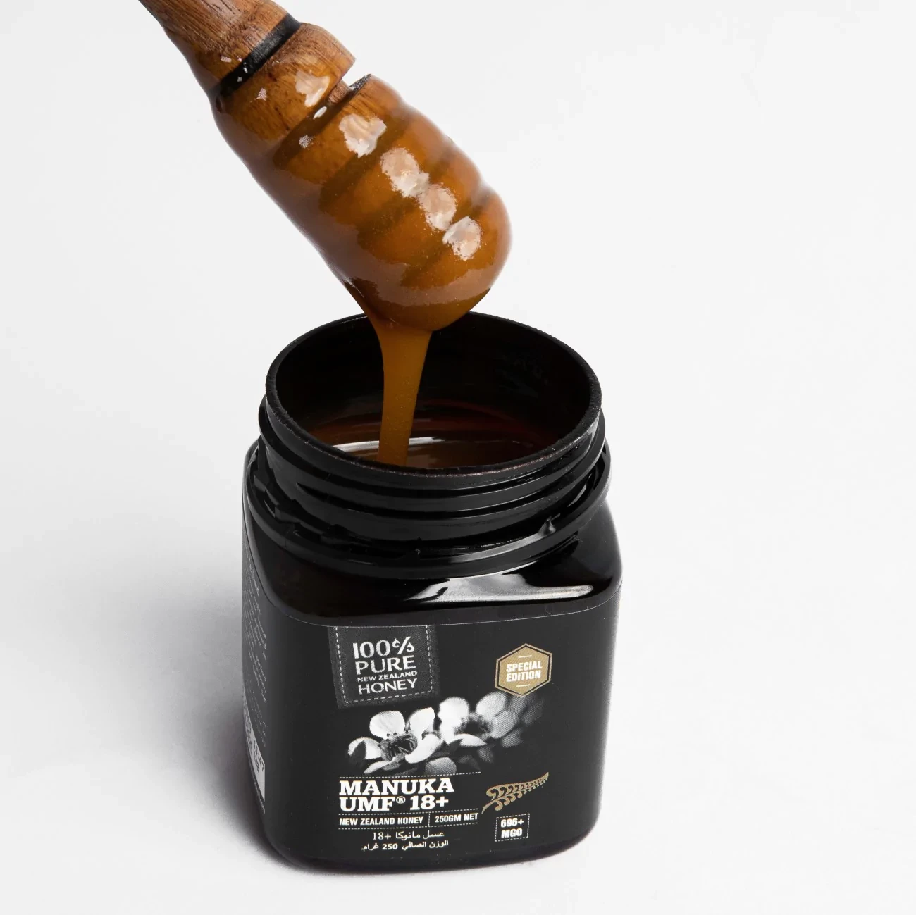 One of the rarest forms of genuine Manuka honey, UMF 18+ is high in MGO (minimum 696 mg/kg) and other unique chemical markers. This honey is sourced from a small selection of premium locations that deliver the purest Manuka honey. A stronger taste and thicker texture, UMF 18+ is preferred by those who want a high concentrated manuka honey.