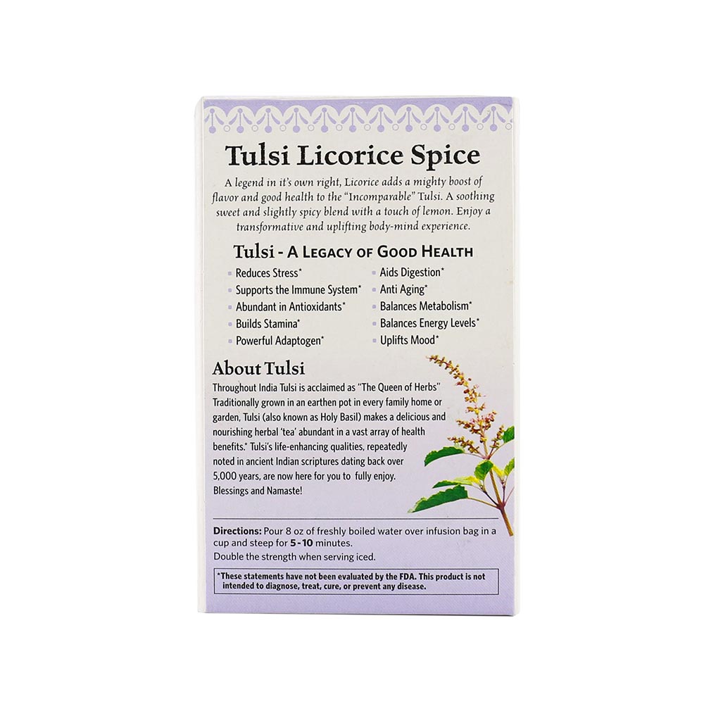 Organic India Tulsi Licorice Spice Tea is known as the great harmonizer in Chinese medicine, brings its soothing sweet character to India’s legendary sacred herb, Tulsi, producing a warming tea with flavor notes of spicy cinnamon, ginger, and lemon.