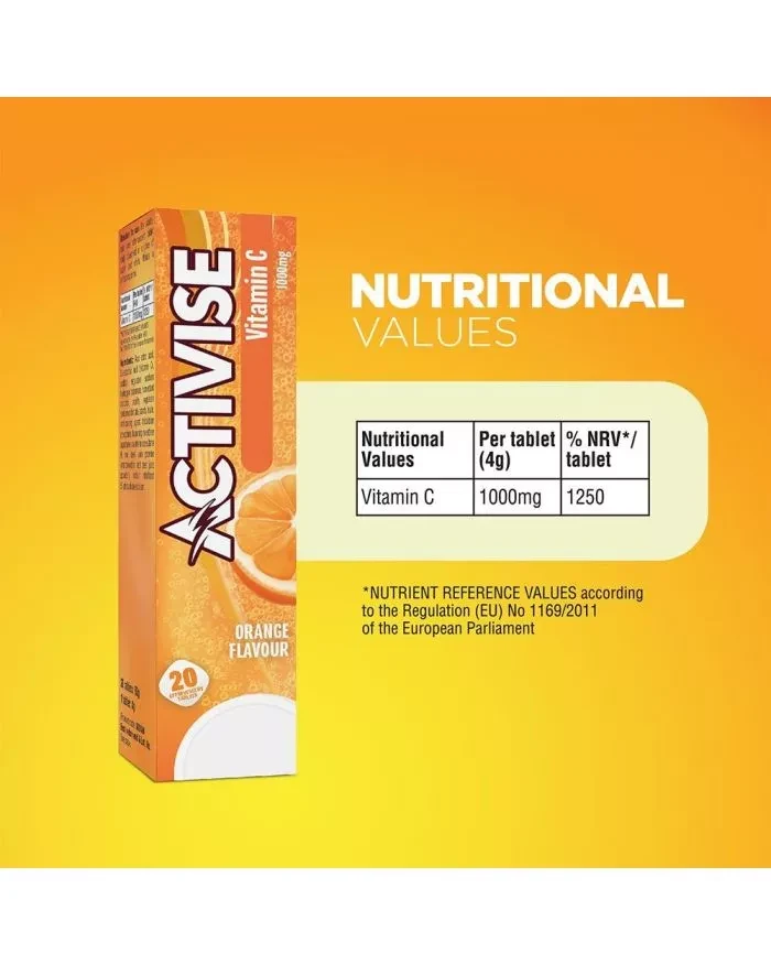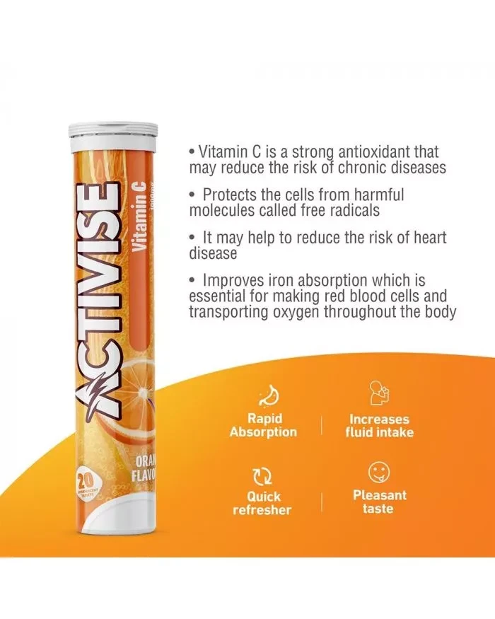 Energize your immune health with Activise Vitamin C 1000mg Effervescent Tablets. This pack of 20 tablets combines the power of high-dose Vitamin C with a burst of refreshing orange flavor. As a key player in supporting your immune system, these effervescent tablets make wellness a zesty experience.