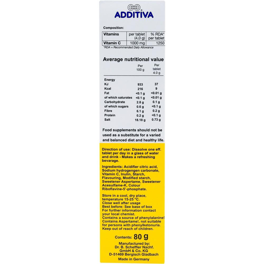 - Dosage: Take one effervescent tablet of Additiva Vitamin C 1000 mg daily, or as directed by a healthcare professional.