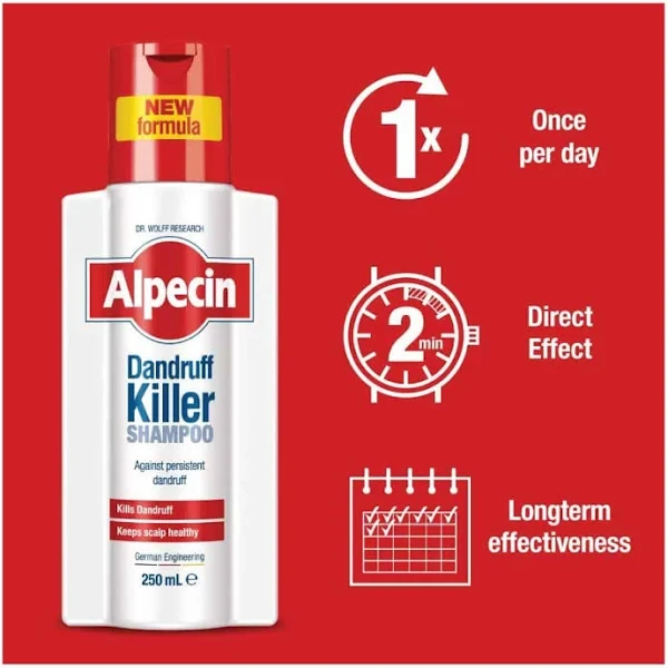 Alpecin Dandruff Killer Shampoo is formulated with four different active ingredients with four different modes of action to form an effective anti-dandruff defense system. Zinc pyrithione and piroctone olamine are effective against fungi, yeast and bacteria. This prevents new dandruff and restores the scalp’s natural balance. Salicylic acid and Fumaric acid help remove existing dandruff. This creates a smooth scalp surface, thereby reducing the colonization of microorganisms in a sustained manner. In addition, panthenol, allantoin and a sophisticated galenic formula prevent irritation and stabilise the scalp's resistance.