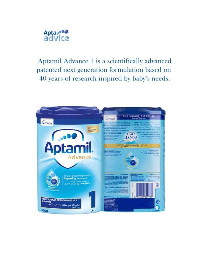 Aptamil Advance 1 Next Generation Milk Infant Formula is a nutritionally complete breastmilk substitute, suitable as the sole source of nutrition from birth to 6 months. Aptamil Advance 1 is a scientifically advanced patented next generation formulation based on 40 years of research inspired by baby's needs. Aptamil Advance 1 infant formula with Pronutra Advance is specifically tailored to support your baby's nutritional requirements from birth up to 6 months. It is the only formula with Pronutra- ADVANCE combining a unique blend of ingredients with an advanced unique process. This includes GOS/FOS, LCPs (Omega-3 (DHA) and Omega-6 (AA)), HMO 3 Galactosyl Lactose, essential vitamins C and D. This exclusive blend of nutrients helps support the baby's overall growth and development. This nutritionally complete infant formula is suitable for healthy infants from birth, requiring a partial or complete breast milk substitute. For formula-fed infants, Aptamil Advance 1 helps build strong foundations for immunity, brain and metabolism. Breastfeeding is best for babies. Breast Milk provides the baby with ultimate protection from illness. It is recommended that Aptamil 1 should be used only on the advice of a doctor.