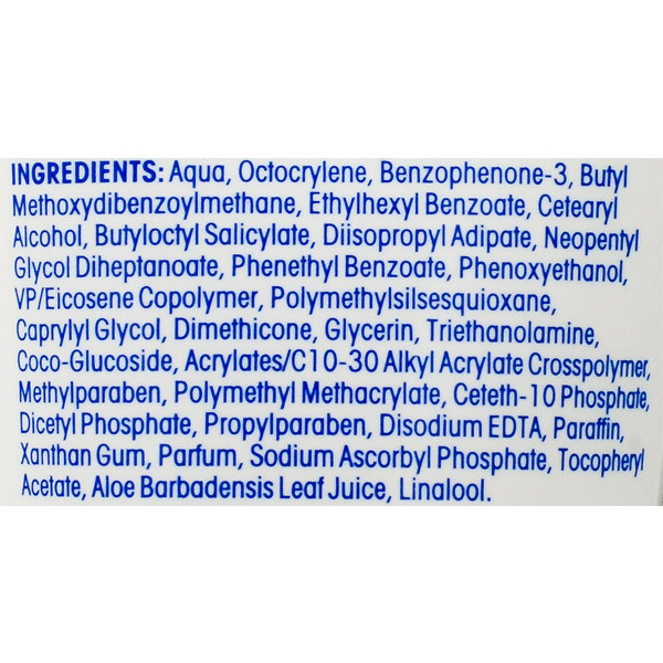 Aqua,Octocrylene,Benzophenone-3,Ethylhexyl Benzoate,Butyl Methoxydibenzoylmethane, Butyloctyl Salicylate,Cetearyl Alcohol,Dilsopropyl Adipate,Phenylethyl Benzoate,Polymethyl Methacrylate,Polymethylsilsesquioxane,VP/Eicosene Copolymer,Caprylyl Glycol,Dimethicone, Glycerine,Triethanolamine,Acrylates/C10-30 Alkyl Acrylate Crosspolymer,Coco-Glucoside, Ceteth-1 0 Phosphate,Dicetyl Phosphate,Disodium EDTA,Paraffin,Xanthan Gum,PEG-8 Dimethicone,Aloe Barbadensis Leaf Juice,Colocasia Antiquorum Root Extract,Mangifera indica Fruit Extract,Passiflora Incarnata Fruit Extract,Plumeria Acutifolia Flower Extract, Octyldodecanol,Retinyl Palmitate,Silica,Tocopheryl Acetate,Carica Papaya Fruit Extract, Psidium Guajava Fruit Extract,Ascorbic Acid,Sodium Propoxyhydroxypropyl Thiosulfate