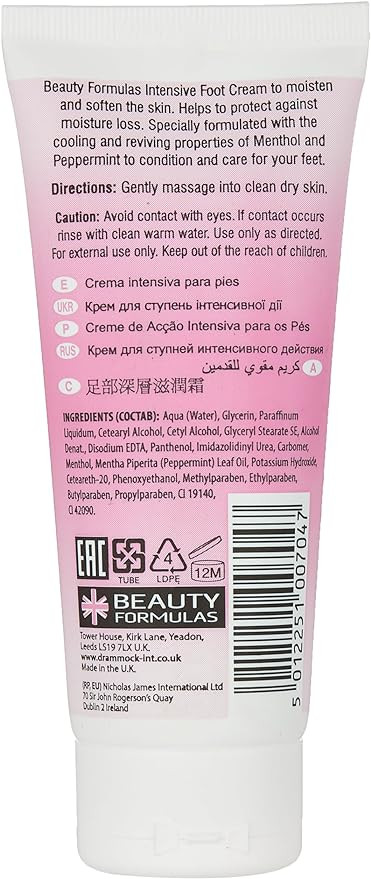 : Beauty Formulas Intensive Foot Cream is a rich, moisturizing formula specifically created to care for dry and rough feet. Enriched with nourishing ingredients such as shea butter and vitamin E, this cream provides intense hydration and helps to repair cracked heels and soften calluses. Regular use promotes smoother, healthier-looking feet, making it an essential part of your foot care routine. Suitable for daily use, apply generously and massage into clean, dry feet to enjoy the soothing benefits.