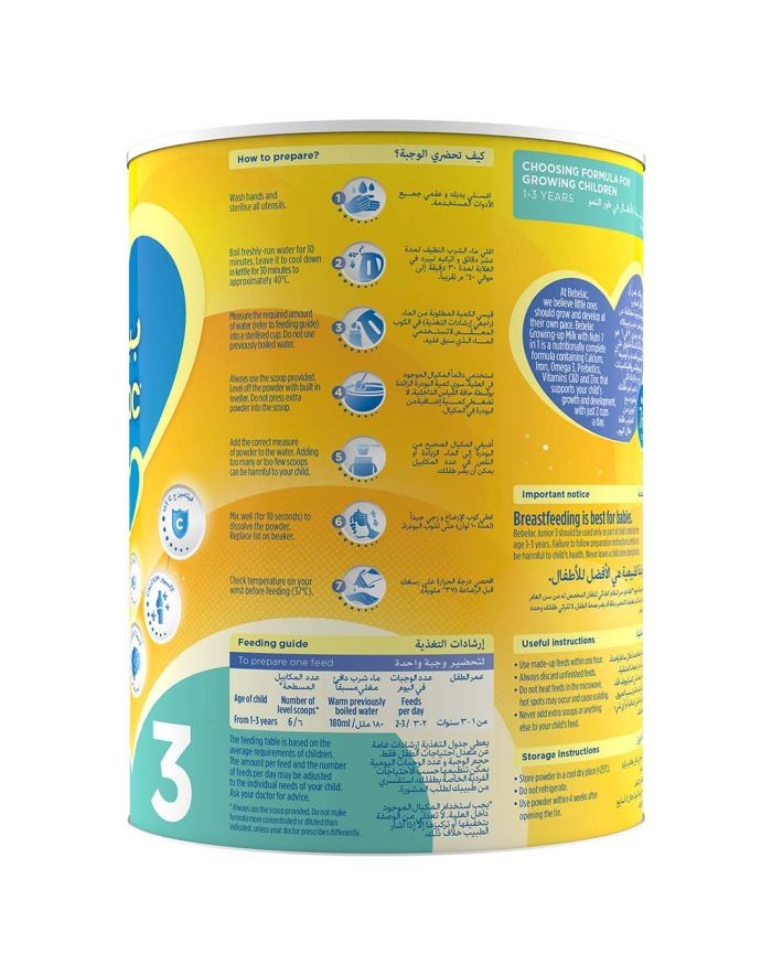Bebelac Junior Nutri 7 In 1 Stage 3 Growing-Up Milk Formula Suitable as a sole source of nutrition or as a supplement to the diet for children aged 1-3 years.
