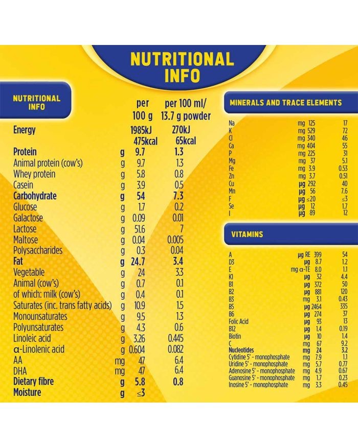 Demineralized whey (from cow's milk),Vegetable oils (Palm oil,Low Erucic acid Rapeseed oil, Coconut oil,Sunflower oil,Single cell oil),Lactose (from cow's milk),Skimmed milk (cow's), Dietary fibers (Galacto-oligosaccharide (from cow's milk),Fructo-oligosaccharide),Whey protein concentrate (from cow's milk),Calcium carbonate,DHA (from fish oil),Potassium chloride,tri Potassium citrate,Magnesium chloride,L-ascorbic acid,Choline chloride,Soy lecithin (emulsifier 41.1g/100kg),Taurine,Sodium L-ascorbate,tri Sodium citrate,tri calcium phosphate,Ferrous sulphate,DL-α tocopheryl acetate,Zinc sulphate,Uridine 5'-monophosphate sodium salt,Cytidine 5'-monophosphate,Inositol,Adenosine 5'-monophosphate,Inosine 5'-monophosphate sodium salt,Nicotinamide,L-Tryptophan,Guanosine 5'-monophosphate sodium salt,Calcium D-pantothenate,Pteroylmonoglutamic acid,Copper sulphate,Retinyl palmitate,DL-α-tocopherol,D-Biotin,Cyanocobalamin,Thiamine hydrochloride,Cholecalciferol,Pyridoxine hydrochloride,Manganese sulphate,Potassium iodide,Sodium selenite,Phytomenadione,L-carnitin,Riboflavin. Contains: Fish,Soybeans,Milk (cow's milk)..