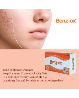 Benz-ox Benzoyl Peroxide Soap For Acne Treatment & Oily Skin is a mild skin friendly soap of pH 5.5 containing Benzoyl Peroxide as the active ingredient. Benzoyl peroxide is used to treat acne. It works as an antiseptic to reduce the number of germs (bacteria) on the surface of your skin by gradually liberating Oxygen (in the presence of water) which kills bacteria. Benz-ox Soap is indicated for the topical treatment of non-inflammatory and inflammatory acne vulgaris. Benzoyl peroxide attacks the bacteria on your skin. It also helps to unclog pores by removing dead skin to prevent blockages. This treats existing acne and may help prevent new spots. Benzoyl Peroxide Acne Soap helps minimize the amount of acne-causing bacteria in the skin, hence less bacteria are contributing to less breakouts, also helps to keep pores free of blockages. It works best when used regularly.