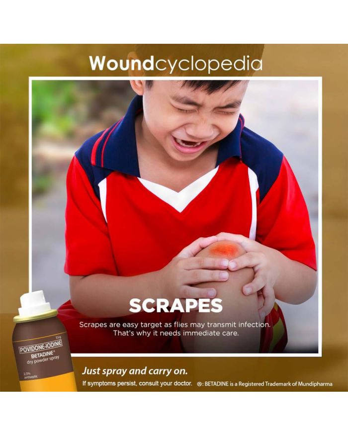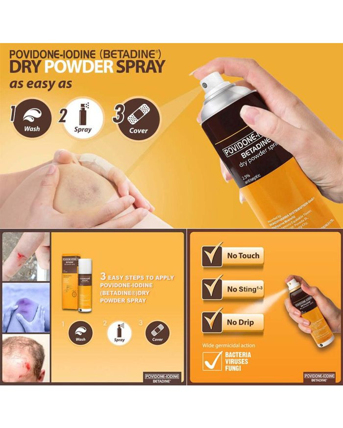 Betadine Dry Powder Spray contains an active ingredient, Povidone-iodine 2.5% w/w for treatment and prevention of infections in wounds. It has a broad microbicidal spectrum. It is rapidly effective in killing most organisms in vitro.