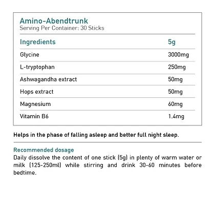 BIOGENA Amino-Abendtrunk is a premium dietary supplement provided in convenient stick packs. Each box contains 30 sticks, carefully formulated to support relaxation, promote better sleep, and aid in post-workout recovery.
