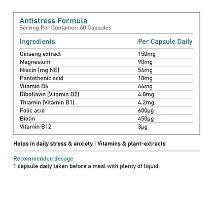 Biogena Antistress Formula is a natural dietary supplement carefully crafted to help manage stress and promote relaxation. Each capsule contains a unique blend of adaptogens, vitamins, and minerals that work synergistically to support the body during times of stress, helping you feel calmer and more balanced.