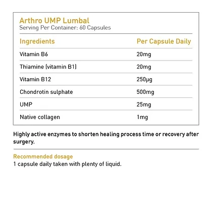 Biogena Arthro UMP Lumbal is an advanced dietary supplement designed to support joint health, specifically targeting the lumbar region. Each capsule contains a unique blend of nutrients, vitamins, and minerals that work synergistically to promote joint comfort and mobility in the lower back area.