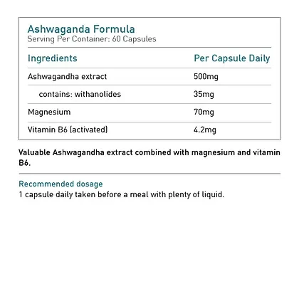 Take one capsule of BIOGENA Ashwagandha Formula daily with a meal or as directed by your healthcare professional. Swallow the capsule with a glass of water. For optimal results, use consistently and complement with a balanced diet and a healthy lifestyle. If you are pregnant, nursing, or have any underlying medical conditions, consult your doctor before starting the supplement.