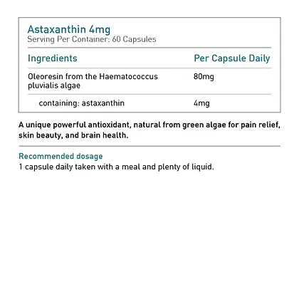 Each capsule contains 4mg of Astaxanthin derived from natural microalgae, along with other inactive ingredients like cellulose, magnesium stearate, and vegetarian capsules (hypromellose, water).