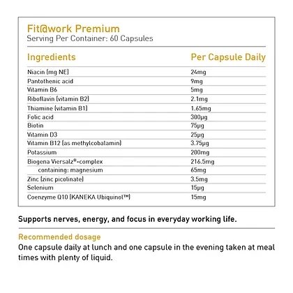 Take two capsules of BIOGENA Fit At Work Premium daily with a meal or as directed by your healthcare professional. Swallow the capsules with a glass of water. For optimal results, use consistently and complement with a balanced diet and regular exercise routine.