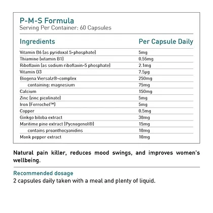 Ingredients: Each capsule of BIOGENA Nutrifem PMS Formula typically contains a blend of essential vitamins, minerals, and botanical extracts, which may include B vitamins, Vitamin E, Calcium, Magnesium, Dong Quai Extract, Chaste Berry Extract, and other PMS-targeted nutrients.