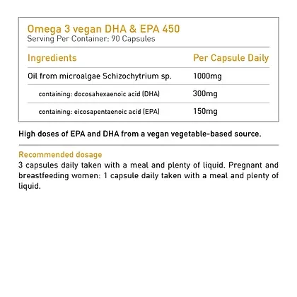 Each capsule contains a blend of vegan-friendly Omega-3 fatty acids derived from algal oil, including 450mg of DHA (Docosahexaenoic Acid) and EPA (Eicosapentaenoic Acid). Other inactive ingredients may include high oleic sunflower oil, natural mixed tocopherols (antioxidant), and vegetarian capsules (modified corn starch, glycerin, carrageenan, sorbitol, and purified water).