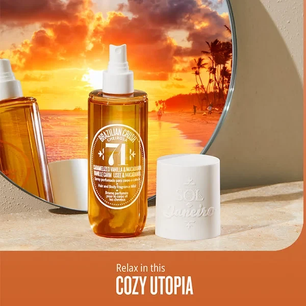 Brazilian Crush Cheirosa 71 - Hair & Body Perfume Mist is a delightful and invigorating fragrance mist designed to add a touch of warmth and sweetness to your hair and body. Inspired by the tropical vibes of Brazil, this mist combines a unique blend of scents, including caramelized vanilla, toasted macadamia nut, and sea salt. It is ideal for those seeking a refreshing and uplifting fragrance that lingers throughout the day.