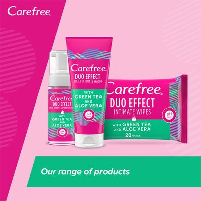 Carefree Duo Effect Daily Intimate Cleansing Wash combines the soothing properties of green tea and aloe vera for effective daily feminine hygiene. This gentle formula is specifically designed to maintain the natural balance of your intimate area while providing refreshing cleansing and hydration. Ideal for everyday use, this intimate wash helps you feel clean, fresh, and confident all day long.