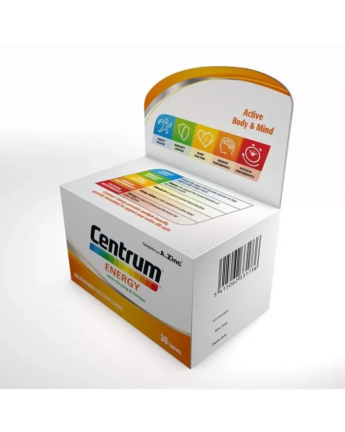 Centrum Energy is a daily multivitamin with Ginseng to support physical performance to suit an active lifestyle. Centrum Performance Energy includes pantothenic acid and Ginkgo Biloba which helps maintain an active mind and zinc which contributes to the maintenance of normal bones. In addition, vitamins, B6 and B12 help unlock energy from your diet. Centrum Energy contains a special micronutrient formula supplemented with ginseng & ginkgo biloba extracts to support the needs of adults with active lifestyles.