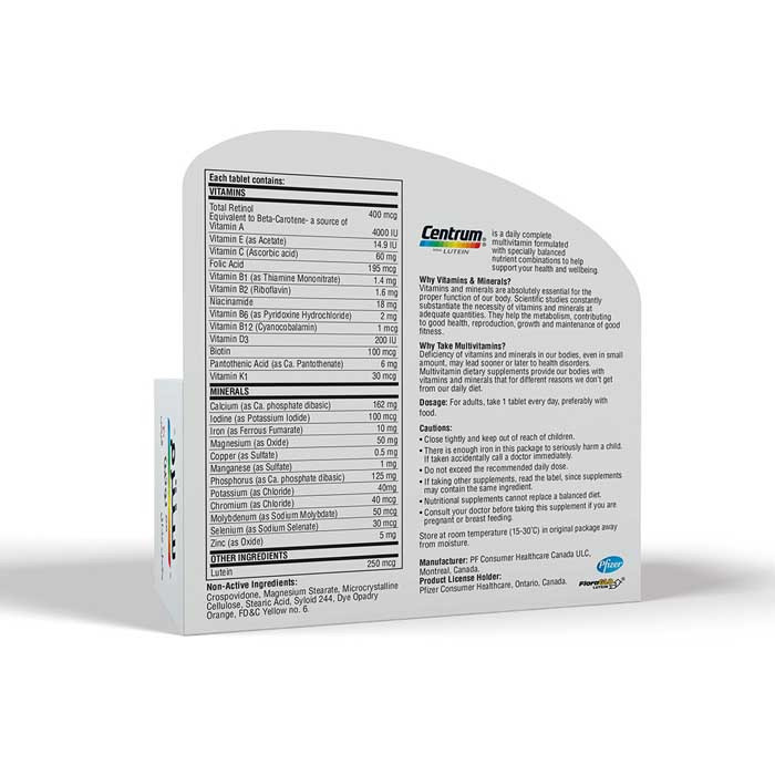 Centrum With Lutein contains a balanced mix of essential vitamins and minerals, including: