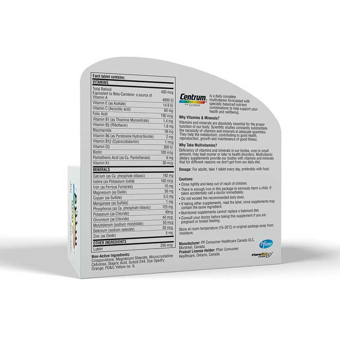Centrum with Lutein is a balanced food supplement. It is designed to help you fulfill your nutritional needs and support your everyday health and wellbeing. The nutrient formula for Centrum Lutein contains a balanced amount of all essential vitamins, plus important minerals and trace elements making it an ideal supplement to your own diet. Centrum Lutein contains 24 key nutrients, supports the general wellbeing of adults, and completes from A to Zinc. It is free from sugar, gluten & lactose.