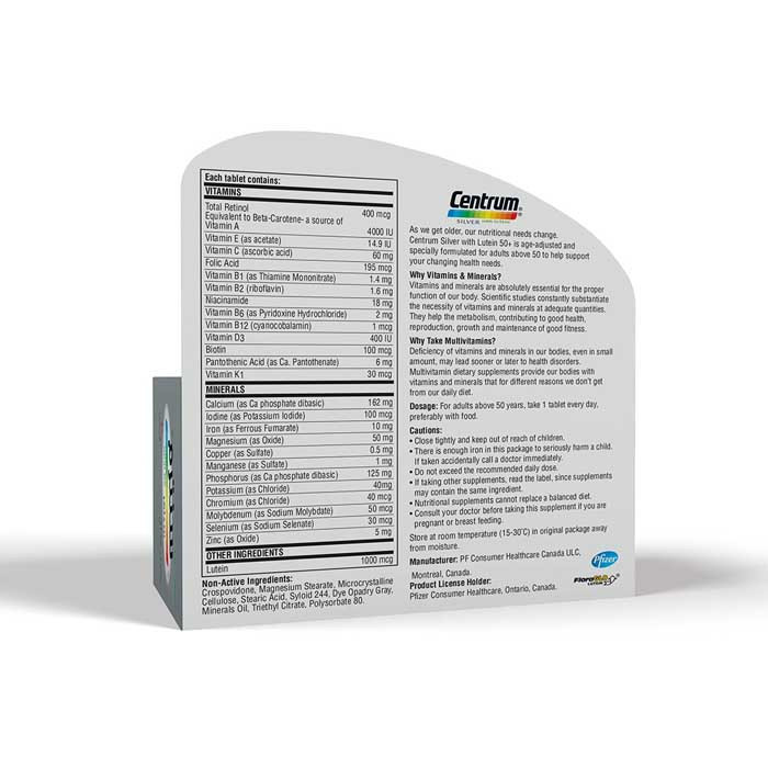 Centrum Silver with Lutein 50+ Adult Multivitamin Tablets is specially crafted for healthy aging in your 50s and beyond. It’s made with high-quality ingredients and all the essential vitamins and minerals to keep your heart, brain, and eyes healthy and protected. It is packed with key essential nutrients important in supporting your whole body and to help meet your nutritional needs. It contains vitamin D central to healthy bones influences cell growth and immune function, keeping inflammation in check, Thiamin necessary for the proper function of muscles and the nervous system, Vitamin B12 a water-soluble B vitamin with a key role in the normal functioning of metabolism and formation of blood, Riboflavin which works with several B vitamins to help with energy production, Manganese essential for collagen formation, bone strength, and metabolization of amino acids, fats, carbohydrates, and cholesterol and several other vitamins as well as vital minerals with Lutein.