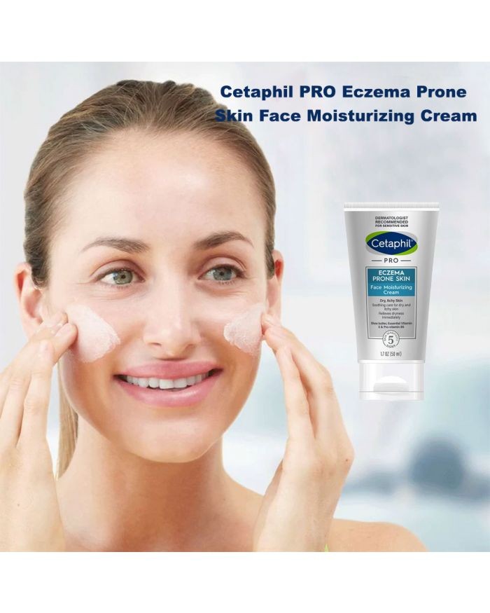 Cetaphil Pro Eczema Prone Skin Face Moisturizing Cream reduces itching, redness, and irritation. It soothes, moisturizes, and protects sensitive skin prone to eczema. It quickly absorbs and has a non-sticky formula that does not irritate the eyes.