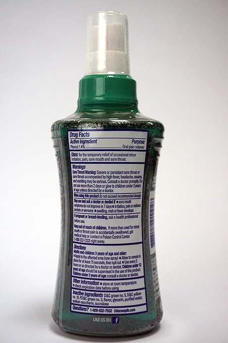 Phenol 1.4% - Acts as an oral anesthetic and analgesic to temporarily relieve pain associated with sore throats.