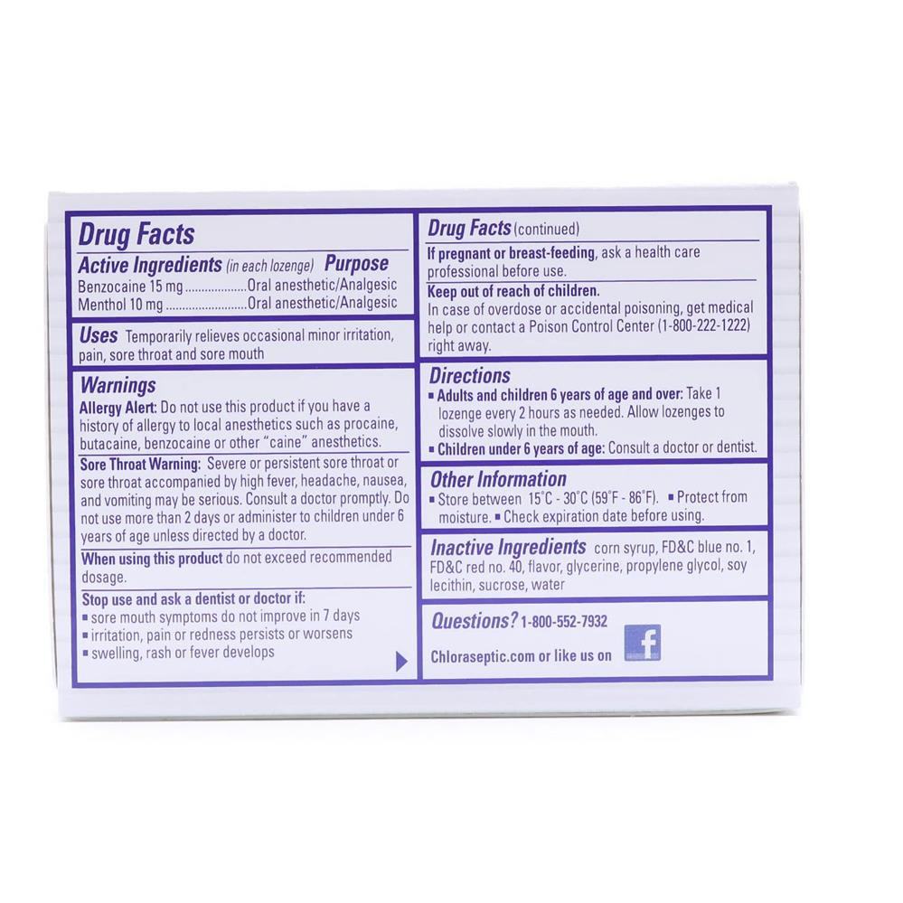 Chloraseptic lozenges relieve your sore throat pain quickly with a soothing cherry liquid center. It contains benzocaine which temporarily relieves minor irritation, pain, mouth sores and sore throat. When used as directed, it provides safe, effective and fast relief. with Chloraseptic lozenges, you get fast acting, on-the-go numbing relief in seconds as the lozenge dissolves.