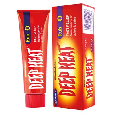 Deep Heat Rub is a non-greasy pain relieving cream to be applied to the skin. The penetrating warmth of Deep Heat helps stimulate circulation, relax stiffness and deoxygenate tense, painful tissues. Its counter irritant action makes it effective in the treatment of muscular pains and stiffness including rheumatic pain, backache, fibrosis, lumbago and sciatica. It can also be used for the treatment of chilblains, bruises and sprains and is suitable for minor sports injuries. Also can be used before or after exercise and contains ingredients that provide pain-relief plus heat. Heat therapy helps to increase blood supply to relax and soothe.