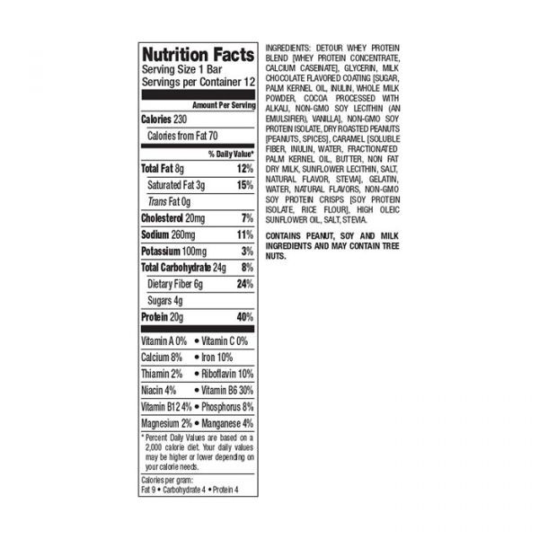 Detour Simple Caramel Peanut contains a proprietary blend of high-quality protein (whey protein concentrate, soy protein isolate), caramel layer, peanuts, various natural flavors, and other ingredients that contribute to the bar's taste, texture, and nutritional profile.