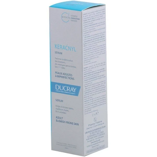 Ducray Keracnyl Face Serum is the first concentrated anti-blemish, anti-brown spot and anti-aging care. Myrtacine, patented innovation, helps fight against P. Acnes bacteria by reducing its biofilm formation. It soothes skin and corrects spots. Vitamin PP soothes irritations and helps resorb blemishes. Azelaic acid, a scientifically recognized active, helps correct stubborn residual hyperpigmented and fine lines. Glycolic acid, AHA, an activity recognized for its "gentle peel" effect smooths the skin's micro-texture and unblocks pores. Spots are reduced. Skin is smoothed, tone looks even and radiant again