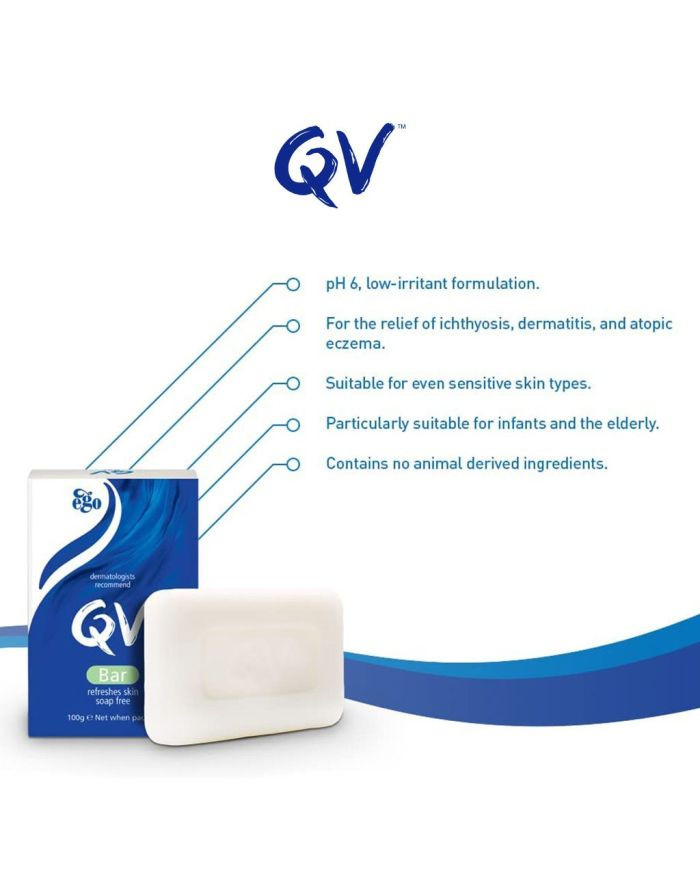 Refresh your skin with QV Bar, a mild, effective soap-free cleansing bar specially formulated for dry or sensitive skin. For those who prefer a cleanser that can be held in the hand like normal soap. QV Bar moisturizes as it cleanses and leaves skin feeling soft and smooth. Suitable for daily use on the face and body. pH balanced to help maintain the skin€™s natural protection. Soaps have a higher pH, which may irritate.QV Body Bar is enriched with moisturizers and will leave your skin feeling soft and smooth.