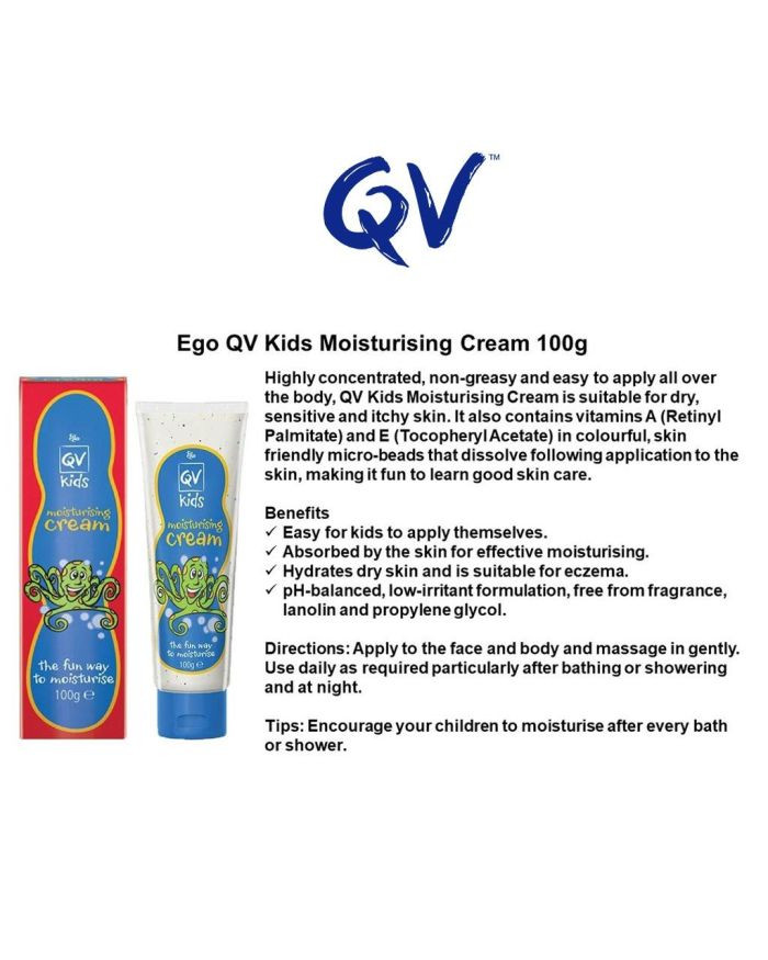 It is highly concentrated, non-greasy and easy to apply all over the body, QV Kids Moisturising Cream is suitable for dry, sensitive and itchy skin. It also contains vitamins A (retinyl palmitate) and E (tocopheryl acetate) in colorful, skin friendly moisturizing beads that dissolve following application to the skin, making it fun to learn good skin care.