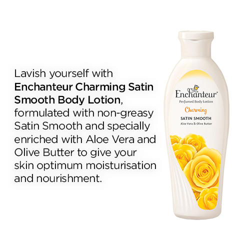 Enchanteur Body Lotion with its uplifting fragrance pampers your skin to perfection. Enriched with Aloe Vera and Olive Butter, to give you Satin Smooth skin with optimum moisturisation and nourishment.