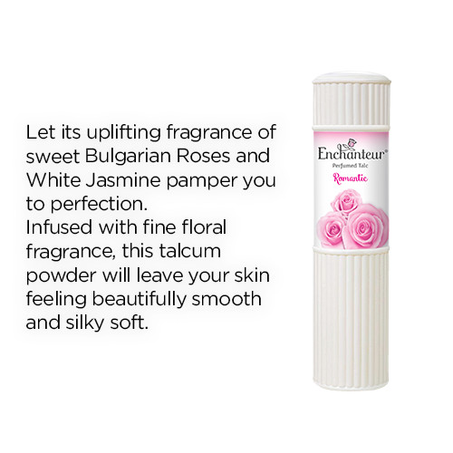 Let the luscious touch of ENCHANTEUR Romantic Perfumed Talc with its uplifting fragrance of sweet Bulgarian Roses and White Jasmine pamper you to perfection.