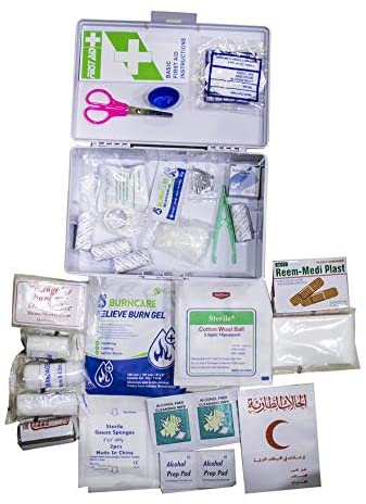• EYE WASHER 1pc.FIRST AID PAPER ADHESIVE TAPE 1.5cmx4.55M 1pcs , 2.5cmx4.55M 1pcs. ADHESIVE TAPE 6cmx1Meter 1pcs. RESUSI SAFE SHIELD 1pcs . FLEXIBLE PLASTER 10cmx30cm 1pc. BURN JEL 3.5g 1pc.BURN FRESSING 10 x 10 cm 1pcs. INSTRUCTION SHEET ENGLISH 1pc.INSTRUCTION SHEET ARABIC 1pc .safety pins 12pcs
