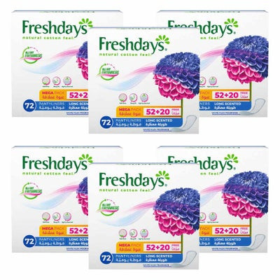 Freshdays Natural Cotton Feel Flexy Fit Odour Control Long Scented Pantyliners are the perfect choice for everyday feminine hygiene. Designed with a soft natural cotton feel, these pantyliners offer exceptional comfort and breathability. The flexy fit design contours to your body for a secure and comfortable fit, while the added odour control and pleasant scent keep you feeling fresh all day long. This pack of 72 x 6 pantyliners provides a convenient solution for women seeking reliable and scented protection.