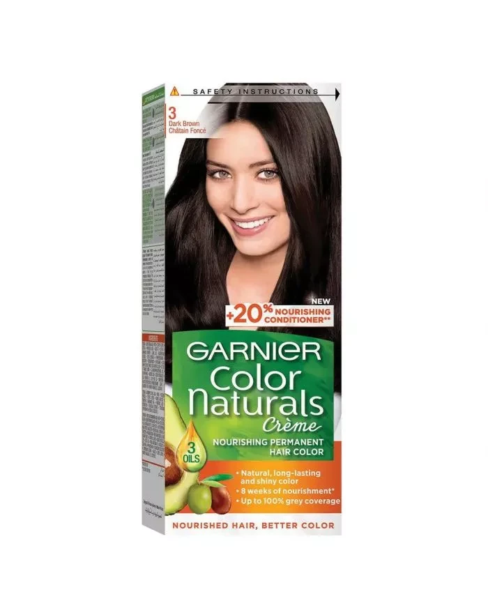 Garnier Color Naturals Cream Hair Color 3 Dark Brown is a permanent color cream enriched with olive oil, that nourishes the hair as it colors. Your hair is deeply nourished, the color is richer, more uniform and shinier. The second ratio of olive oil in the conditioner is a real treatment for your hair. Your hair becomes soft, color radiant and there is no grey hair. This nourishing cream is infused with fruit oil and penetrates deeply into the hair fiber to nourish your hair. It also moisturizes your hair so that it takes better color and holds its natural color longer from root to tip. Easily get a professional result at home.