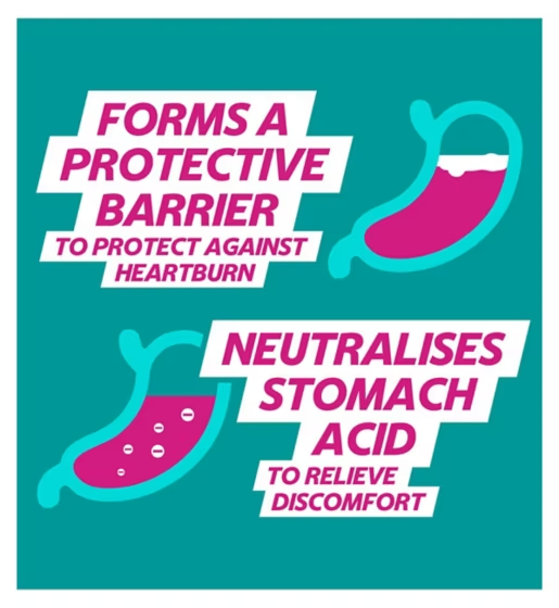 Gaviscon Double Action works in 3 minutes, providing long-lasting relief for up to 4 hours from the pain and discomfort of heartburn and acid indigestion. It gets to work in two different ways: 1. Neutralizing excess stomach acid to relieve pain and discomfort. 2. Forming a protective barrier over the stomach contents to soothe the burning pain in your chest.