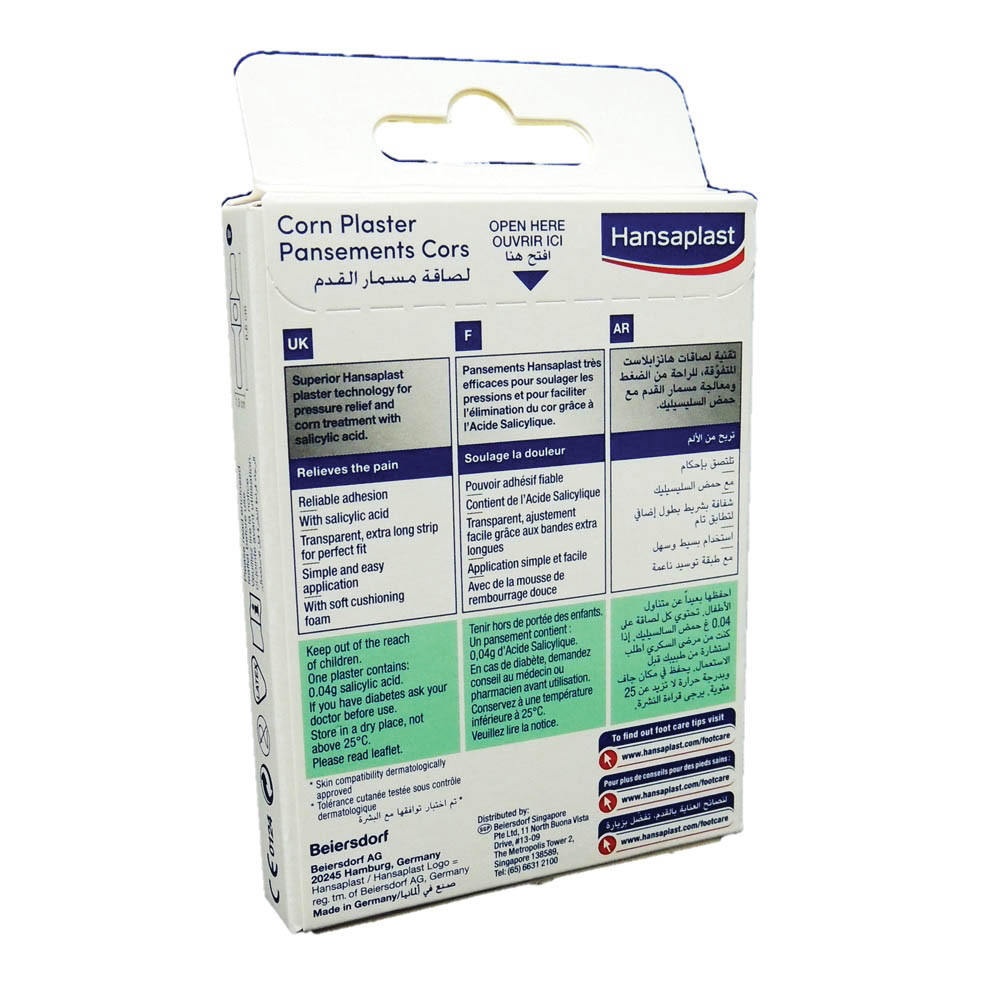 The Hansaplast Corn Plaster softens corns thanks to its active ingredient salicylic acid. Located in the center of the foam ring, this ingredient acts by loosening the structure holding the cells of the corn. The calloused skin and the intercellular substance holding its layers together are loosened, which leads to increased hydration and the softening of the area. One plaster contains 0.04 g salicylic acid.