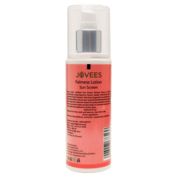 Jovees Water Resistant Sun Screen Fairness Lotion SPF 25 is a specially formulated sunscreen lotion that provides effective sun protection while promoting fairness and even skin tone. This water-resistant sunscreen creates a protective barrier against harmful UVA and UVB rays, preventing sunburn and skin damage. Enriched with natural ingredients, it also works to nourish the skin, leaving it soft, smooth, and radiant.