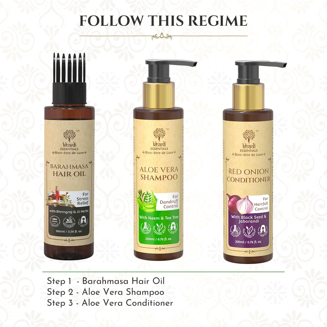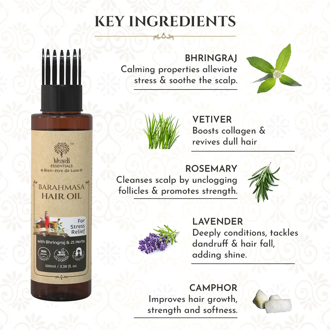 Indulge your hair in the luxurious care of Khadi Essentials Barahmasa Hair Oil. This exquisite blend is meticulously crafted with a harmonious mix of natural ingredients known for their nourishing properties. Let the goodness of Amla, Bhringraj, Brahmi, Vetiver, and other potent herbs and oils transform your hair care routine.