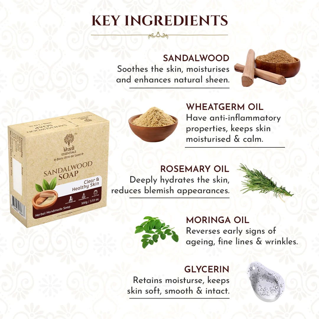 Khadi Essentials Sandalwood Soap is specially crafted to promote clear and healthy skin. Enriched with the goodness of sandalwood, this soap offers a luxurious bathing experience that leaves your skin feeling refreshed and rejuvenated.