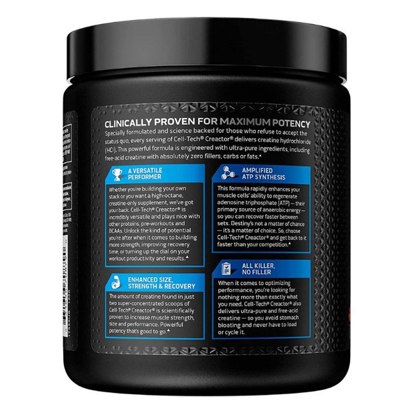 Experience explosive strength gains with MuscleTech Cell Tech Creactor in invigorating Fruit Punch flavor. This advanced creatine formula features creatine HCl and free-acid creatine, delivering 4g of powerful creatine per serving. Mix 1 scoop with water post-workout. Cell Tech Creactor fuels muscle recovery, boosts workout performance, and supports lean muscle growth.