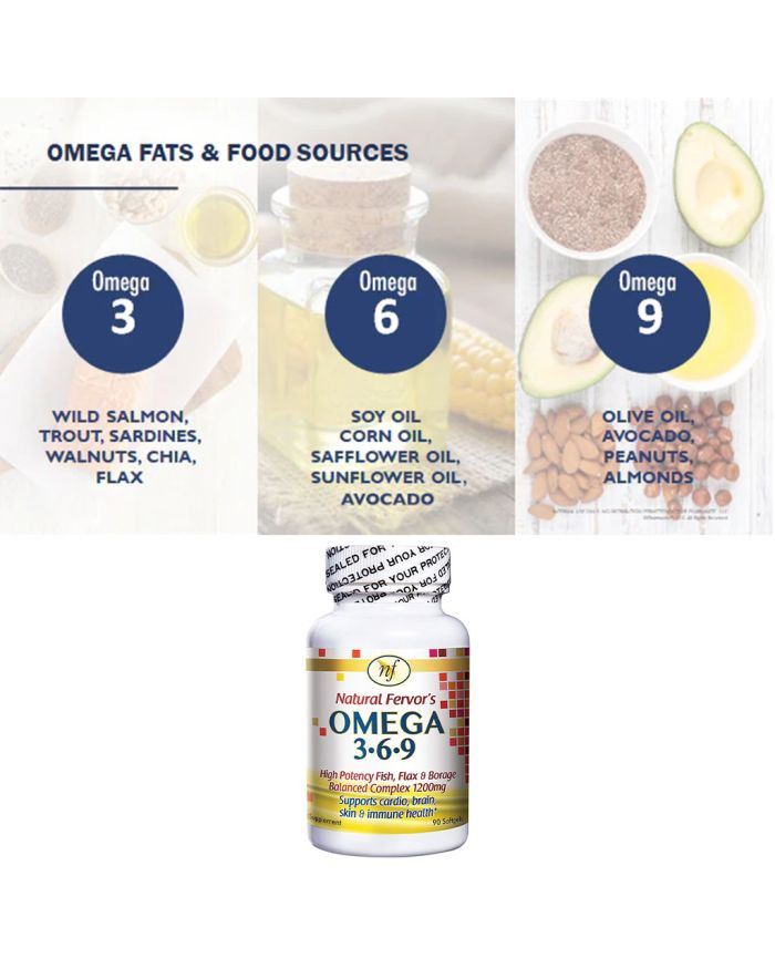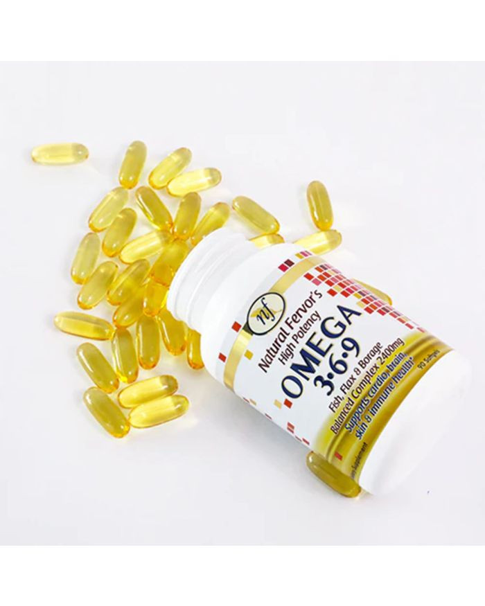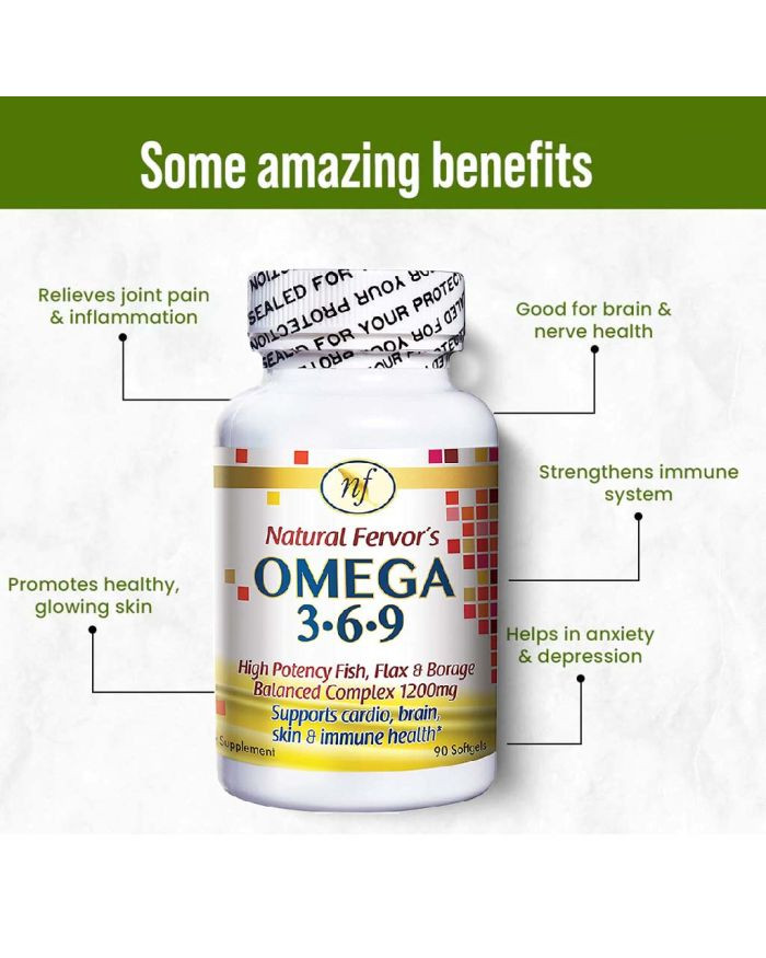 Natural Fervor Omega 3-6-9 Fish Oil, FlaxSeed & Borage Oil Complex Softgel is the source of natural omega 3, 6 & 9 fatty acids for the maintenance of good health. Natural Fervor’s High-Quality Omega 3.6.9 Soft gel helps to promote cardiovascular health, help improve cognitive function, help reduce cholesterol and help reduce inflammation in arthritis. Natural Fervor’s High-Quality Omega 3 Soft gels is a rich source of omega-3, omega 6 and omega 9 fatty acids. To begin with, the omega 9 is a monounsaturated fat, as opposed to a polyunsaturated fat, and that is not actually essential. Omega 3.6.9 capsules provide more benefits to the human body than omega 3 alone. Omega-3 and omega-6 are essential fatty acids, as they cannot be formed in the body. Omega-3 fatty acids comprises Eicosapentaenoic acid (EPA) and Docosahexaenoic acid (DHA) which play important roles in our body. The right balance of Omega 3, 6 & 9 is vital. Omega supplements help boost vitamin contents, and provide potent antioxidant-like properties that help to free the body of toxins and eradicate free radicals before they have time to attack our cells.