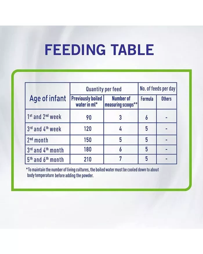 Consult the feeding table, add the exact number of leveled scoops for the age of the baby.