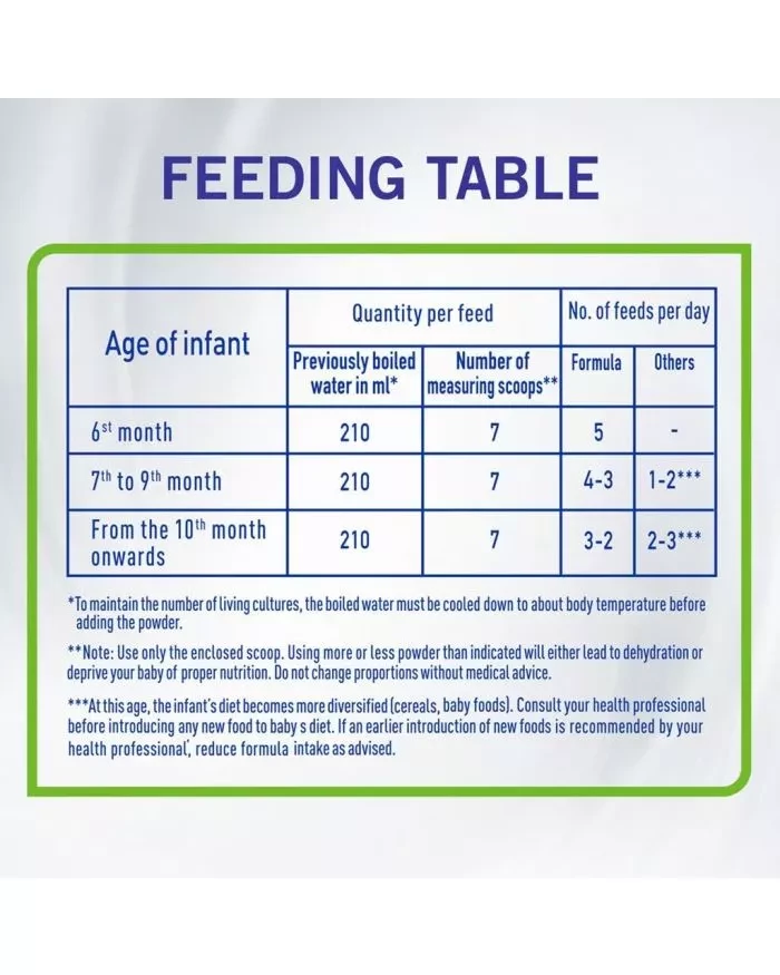 Consult the feeding table, add the exact number of leveled scoops for the age of the baby.