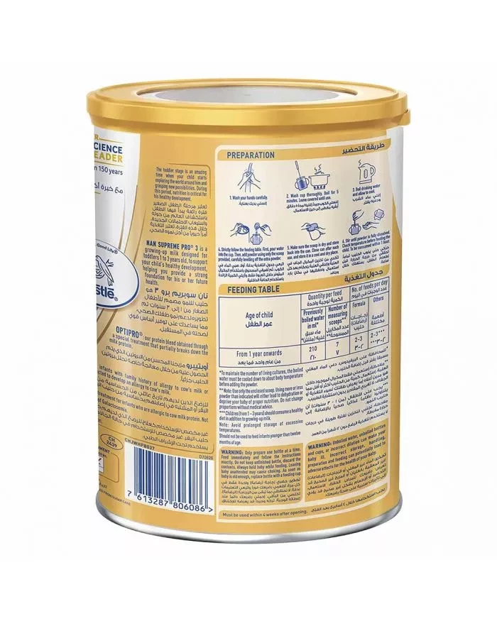 Nestle NAN Supreme Pro Stage 3 Milk Formula Powder is a specialized growing up milk designed for toddlers from 1 to 3 years.