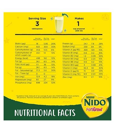 NIDO FORTIFIED with FortiGrow is a full cream milk powder that has a creamy and dense taste. Each spoonful of the fine yellowish powder contains the essential vitamins and minerals needed to strengthen your child's muscles, teeth and bones. NIDO FORTIFIED with FortiGrow is an excellent source of calcium and Vitamin D and is a delicious milk that is so easy to prepare.